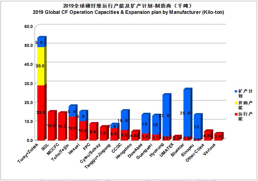在2019年,全世界增加的產(chǎn)能也確實(shí)非常少,之前的擴(kuò)產(chǎn)計(jì)劃,要么在2018年就達(dá)成,要么在2020年達(dá)成,比如ZOLTEK在匈牙利的5,000噸產(chǎn)能,在2020年才能達(dá)成。Hexcel的巨大擴(kuò)產(chǎn)計(jì)劃,在2020年也會(huì)達(dá)成5,000噸;精功碳纖維、韓國(guó)曉星公司的2,000噸也是在2020年達(dá)成。