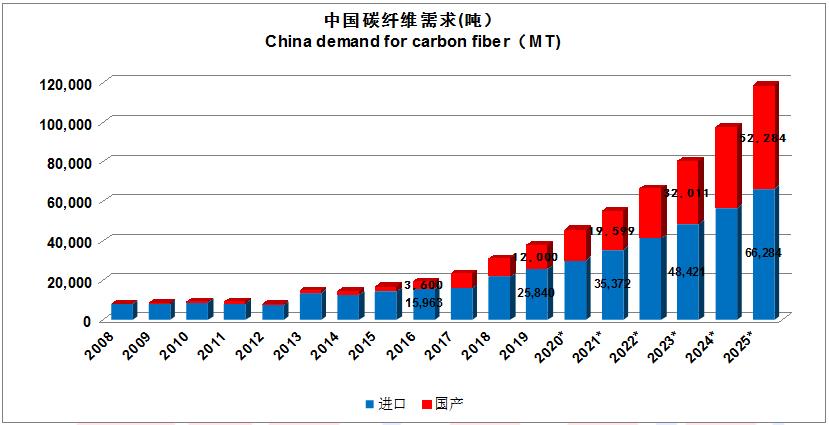 2019年中國(guó)碳纖維的總需求為:37,840噸,對(duì)比2018年的31,000噸,同比增長(zhǎng)了22%,其中,進(jìn)口量為25,840噸(占總需求的68%,比2018增長(zhǎng)了17.5%),國(guó)產(chǎn)纖維供應(yīng)量為12,000噸(占總需求的31.7%,比2018年增長(zhǎng)了33%),2019年的中國(guó)市場(chǎng)的總體情況是:供不應(yīng)求,無(wú)論是進(jìn)口還是國(guó)產(chǎn)纖維。